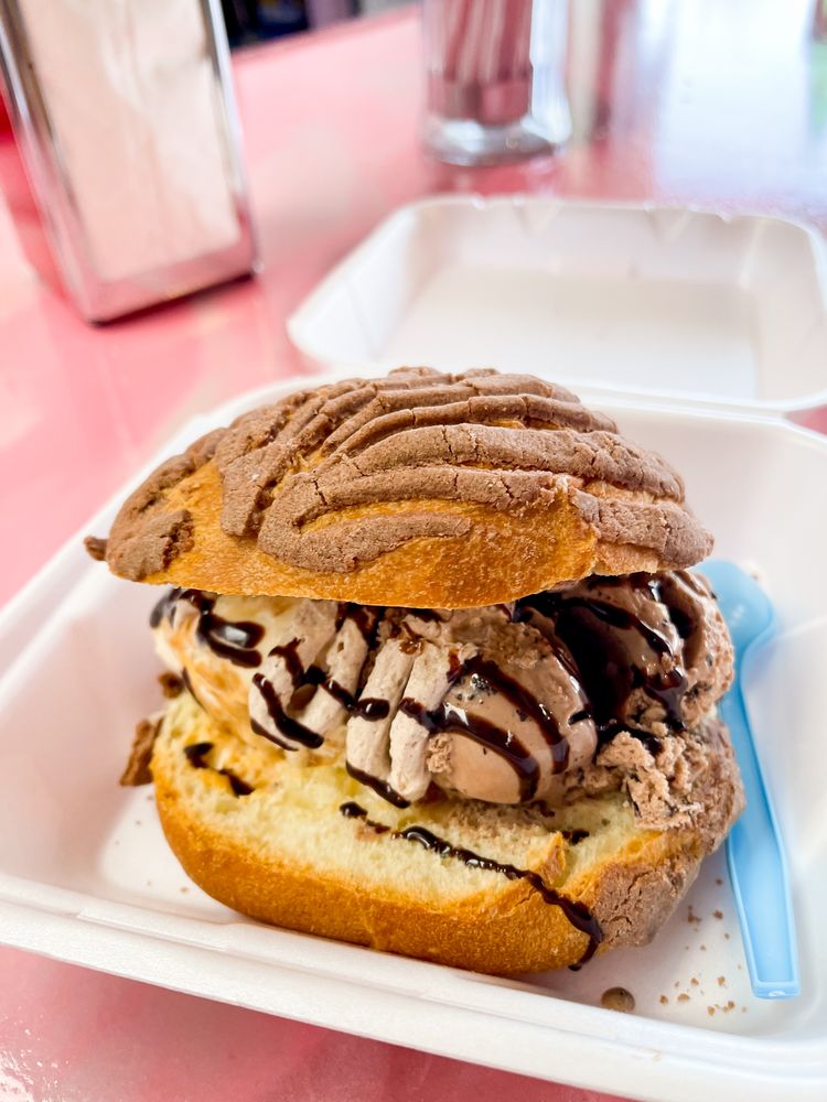 Our sweet concha is topped with our cream me sauce and chocolate sauce and served with your choice of ice cream.